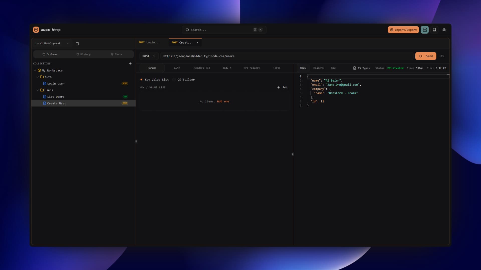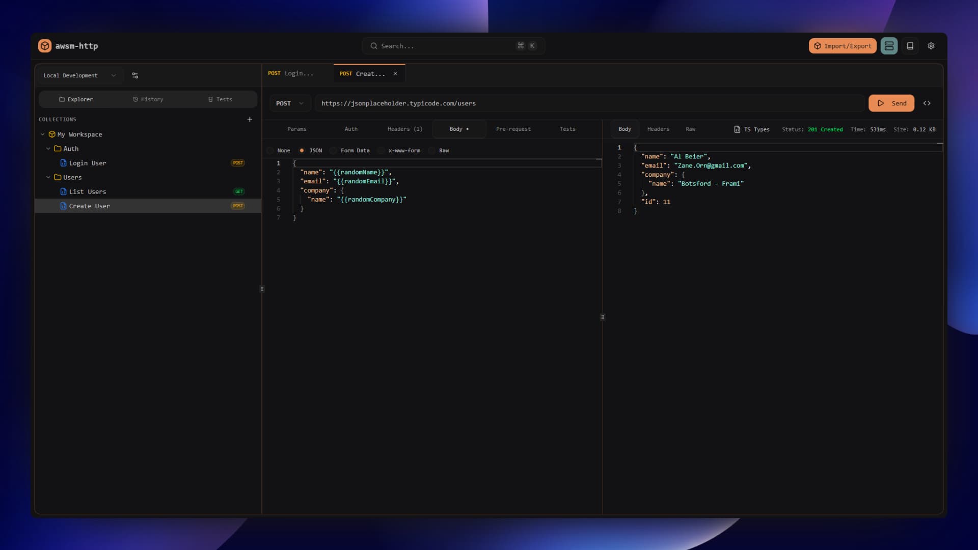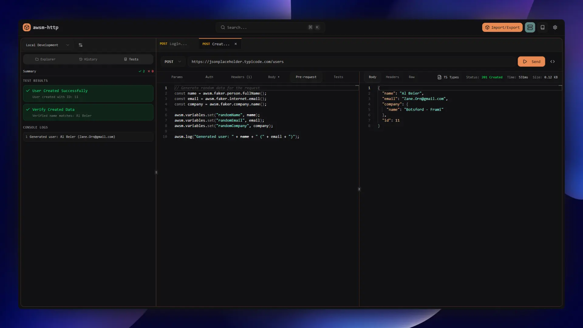 Built-in Faker.js integration lets you generate realistic test data on the fly. Perfect for testing APIs with dynamic, lifelike data.