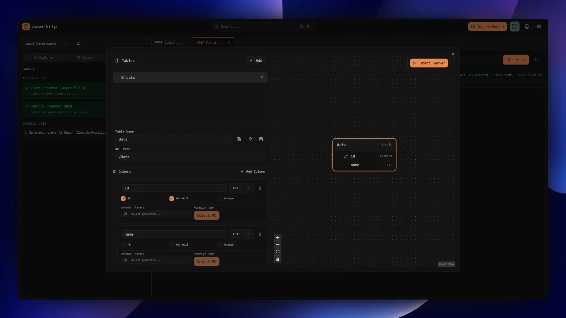 Design your database schema visually and get auto-generated REST APIs with realistic data instantly.