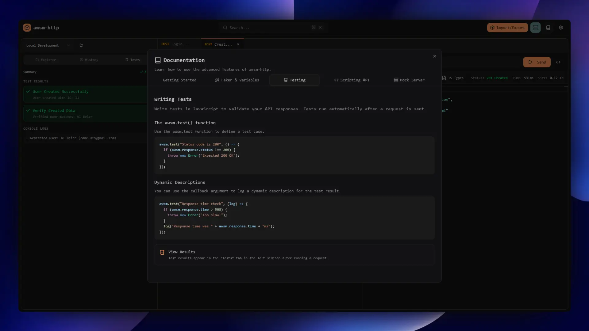Write powerful pre-request and test scripts with the awsm global object. Full control over your API testing workflow.